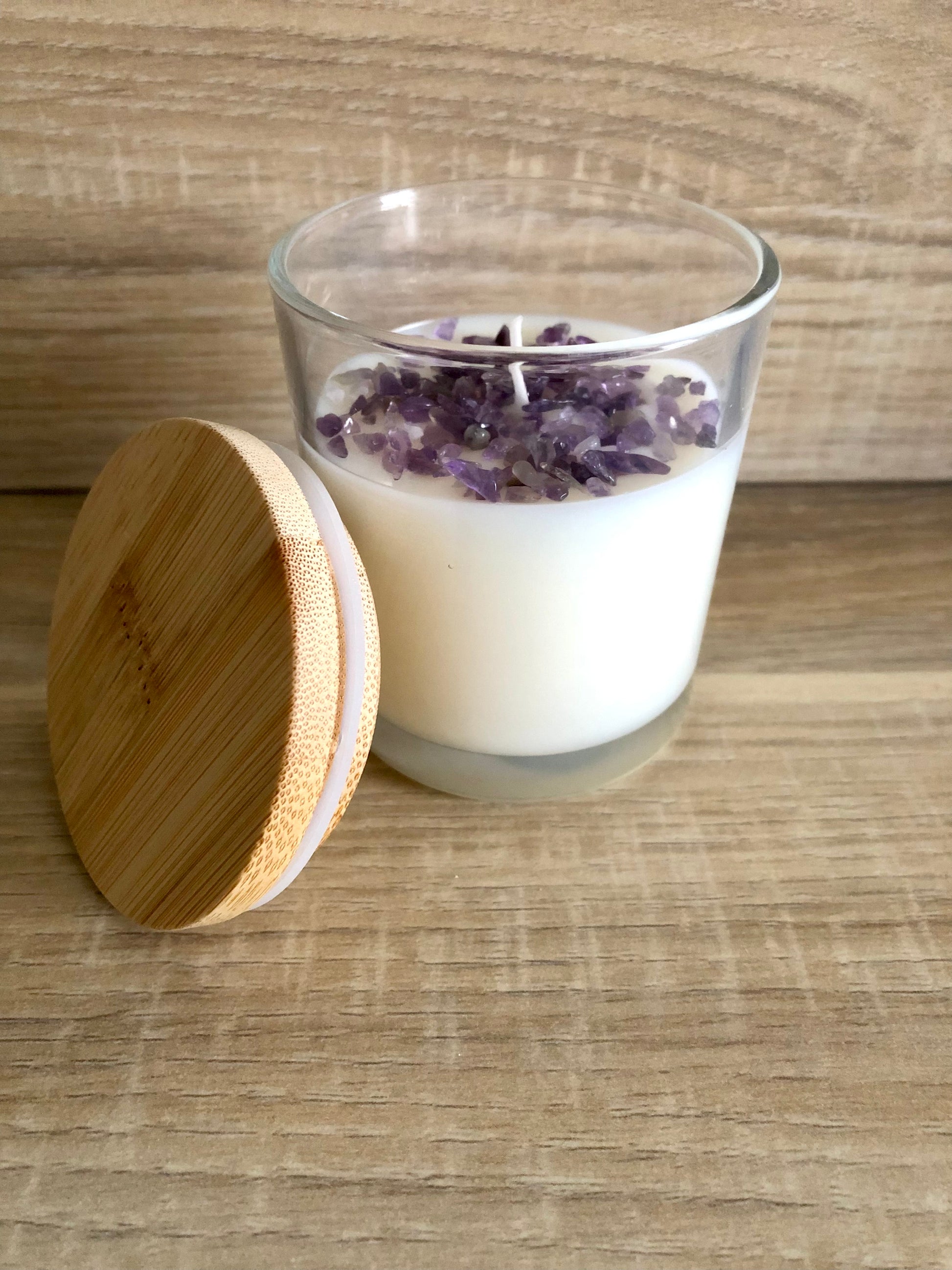 La bougie est accompagnée de pierres d’Améthyste qui accompagneront vos soirées.