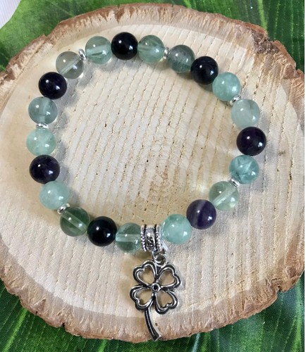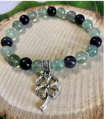 Bracelet en perles rondes naturelles et authentiques de Fluorite & Breloque Trèfle.
